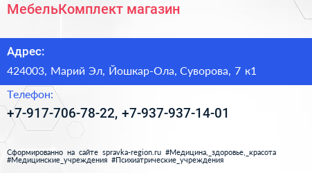 МебельКомплект, магазин по адресу 424003, Марий Эл, Йошкар-Ола, Суворова, 7 к1 в дальнейшем Организация, размещена в следующих категориях: