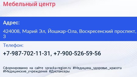 Мебельный центр по адресу 424008, Марий Эл, Йошкар-Ола, Воскресенский проспект, 3 в дальнейшем Организация, размещена в следующих категориях: