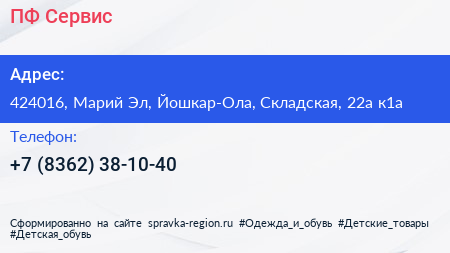 ПФ-Сервис по адресу 424016, Марий Эл, Йошкар-Ола, Складская, 22а к1а в дальнейшем Организация, размещена в следующих категориях: