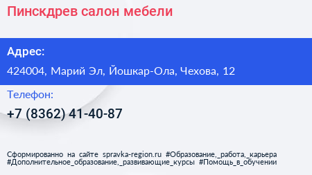 Пинскдрев, салон мебели по адресу 424004, Марий Эл, Йошкар-Ола, Чехова, 12 в дальнейшем Организация, размещена в следующих категориях:
