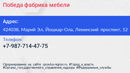 Победа, фабрика мебели по адресу 424038, Марий Эл, Йошкар-Ола, Ленинский проспект, 12 в дальнейшем Организация, размещена в следующих категориях: