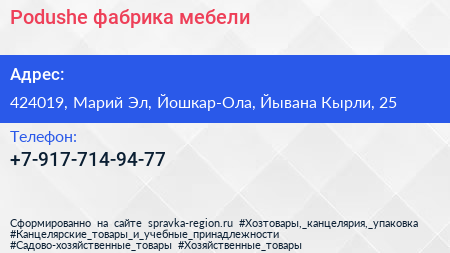 Podushe, фабрика мебели по адресу 424019, Марий Эл, Йошкар-Ола, Йывана Кырли, 25 в дальнейшем Организация, размещена в следующих категориях: