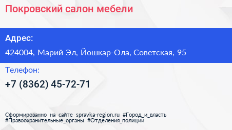 Покровский, салон мебели по адресу 424004, Марий Эл, Йошкар-Ола, Советская, 95 в дальнейшем Организация, размещена в следующих категориях: