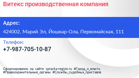 Витекс, производственная компания по адресу 424002, Марий Эл, Йошкар-Ола, Первомайская, 111 в дальнейшем Организация, размещена в следующих категориях: