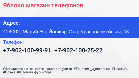 Яблоко, магазин телефонов по адресу 424002, Марий Эл, Йошкар-Ола, Красноармейская, 43 в дальнейшем Организация, размещена в следующих категориях: