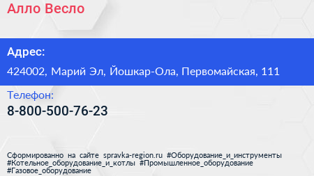 Алло-Весло по адресу 424002, Марий Эл, Йошкар-Ола, Первомайская, 111 в дальнейшем Организация, размещена в следующих категориях: