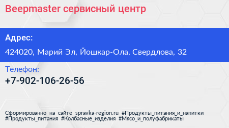 Beepmaster, сервисный центр по адресу 424020, Марий Эл, Йошкар-Ола, Свердлова, 32 в дальнейшем Организация, размещена в следующих категориях: