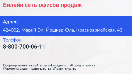 Билайн, сеть офисов продаж по адресу 424002, Марий Эл, Йошкар-Ола, Красноармейская, 43 в дальнейшем Организация, размещена в следующих категориях: