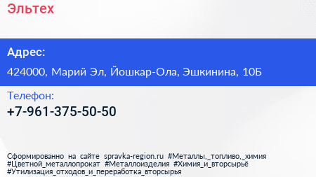 Эльтех по адресу 424000, Марий Эл, Йошкар-Ола, Эшкинина, 10Б в дальнейшем Организация, размещена в следующих категориях: