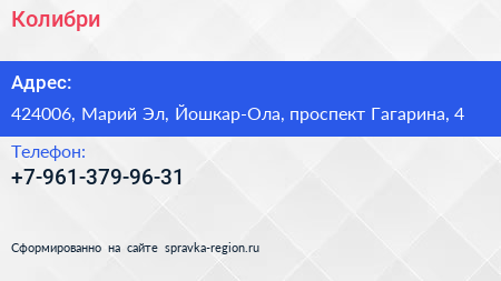 Колибри по адресу 424006, Марий Эл, Йошкар-Ола, проспект Гагарина, 4 в дальнейшем Организация, размещена в следующих категориях: