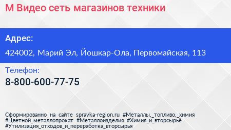 М.Видео, сеть магазинов техники по адресу 424002, Марий Эл, Йошкар-Ола, Первомайская, 113 в дальнейшем Организация, размещена в следующих категориях:
