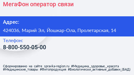 МегаФон, оператор связи по адресу 424036, Марий Эл, Йошкар-Ола, Пролетарская, 14 в дальнейшем Организация, размещена в следующих категориях: