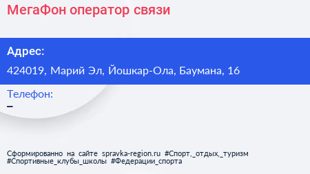 МегаФон, оператор связи по адресу 424019, Марий Эл, Йошкар-Ола, Баумана, 16 в дальнейшем Организация, размещена в следующих категориях: