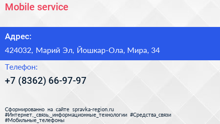 Mobile-service по адресу 424032, Марий Эл, Йошкар-Ола, Мира, 34 в дальнейшем Организация, размещена в следующих категориях: