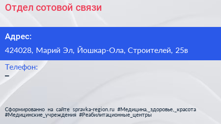 Отдел сотовой связи по адресу 424028, Марий Эл, Йошкар-Ола, Строителей, 25в в дальнейшем Организация, размещена в следующих категориях: