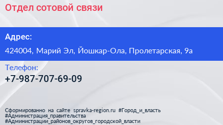Отдел сотовой связи по адресу 424004, Марий Эл, Йошкар-Ола, Пролетарская, 9а в дальнейшем Организация, размещена в следующих категориях: