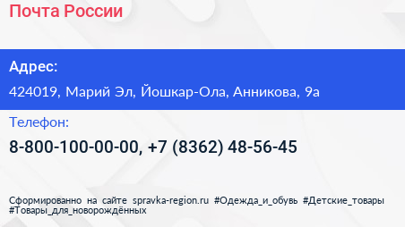 Почта России по адресу 424019, Марий Эл, Йошкар-Ола, Анникова, 9а в дальнейшем Организация, размещена в следующих категориях: