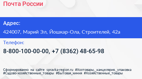 Почта России по адресу 424007, Марий Эл, Йошкар-Ола, Строителей, 42а в дальнейшем Организация, размещена в следующих категориях: