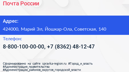 Почта России по адресу 424000, Марий Эл, Йошкар-Ола, Советская, 140 в дальнейшем Организация, размещена в следующих категориях:
