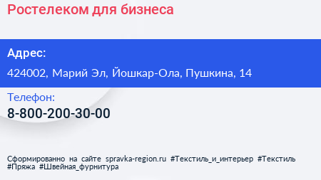 Ростелеком для бизнеса по адресу 424002, Марий Эл, Йошкар-Ола, Пушкина, 14 в дальнейшем Организация, размещена в следующих категориях: