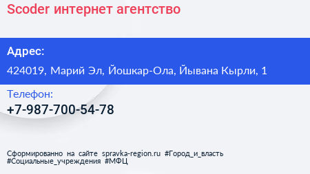 Scoder, интернет-агентство по адресу 424019, Марий Эл, Йошкар-Ола, Йывана Кырли, 1 в дальнейшем Организация, размещена в следующих категориях: