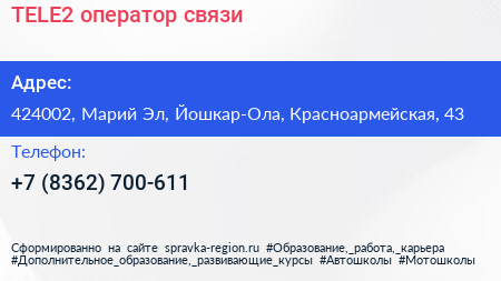 TELE2, оператор связи по адресу 424002, Марий Эл, Йошкар-Ола, Красноармейская, 43 в дальнейшем Организация, размещена в следующих категориях: