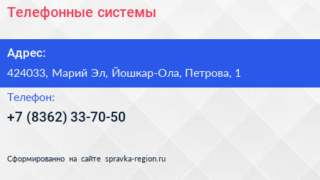 Телефонные системы по адресу 424033, Марий Эл, Йошкар-Ола, Петрова, 1 в дальнейшем Организация, размещена в следующих категориях: