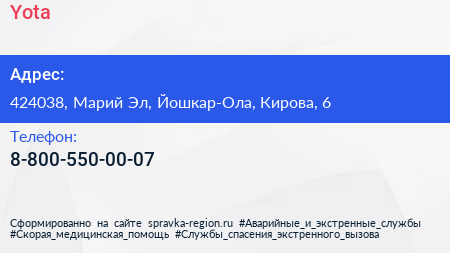 Yota по адресу 424038, Марий Эл, Йошкар-Ола, Кирова, 6 в дальнейшем Организация, размещена в следующих категориях: