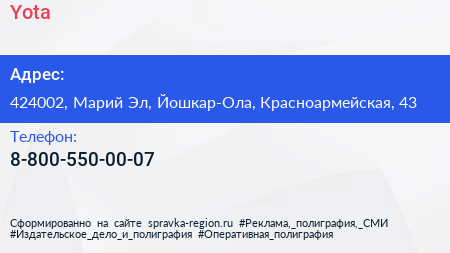 Yota по адресу 424002, Марий Эл, Йошкар-Ола, Красноармейская, 43 в дальнейшем Организация, размещена в следующих категориях: