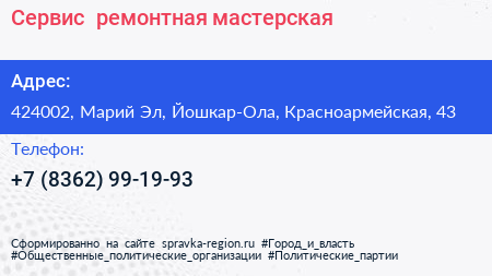 Сервис+, ремонтная мастерская по адресу 424002, Марий Эл, Йошкар-Ола, Красноармейская, 43 в дальнейшем Организация, размещена в следующих категориях:
