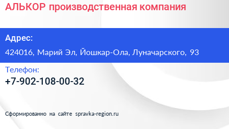 АЛЬКОР, производственная компания по адресу 424016, Марий Эл, Йошкар-Ола, Луначарского, 93 в дальнейшем Организация, размещена в следующих категориях: