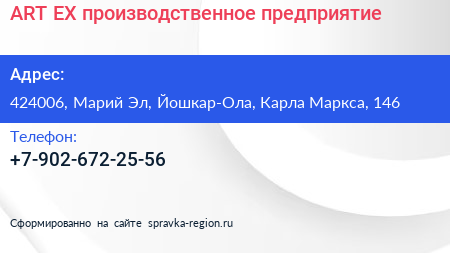 ART-EX, производственное предприятие по адресу 424006, Марий Эл, Йошкар-Ола, Карла Маркса, 146 в дальнейшем Организация, размещена в следующих категориях: