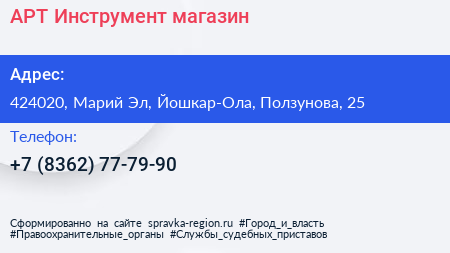АРТ-Инструмент, магазин по адресу 424020, Марий Эл, Йошкар-Ола, Ползунова, 25 в дальнейшем Организация, размещена в следующих категориях: