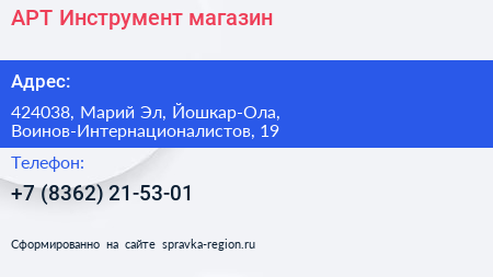 АРТ-Инструмент, магазин по адресу 424038, Марий Эл, Йошкар-Ола, Воинов-Интернационалистов, 19 в дальнейшем Организация, размещена в следующих категориях: