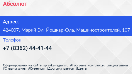Абсолют по адресу 424007, Марий Эл, Йошкар-Ола, Машиностроителей, 107 в дальнейшем Организация, размещена в следующих категориях: