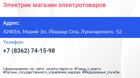 Электрик, магазин электротоваров по адресу 424016, Марий Эл, Йошкар-Ола, Луначарского, 52 в дальнейшем Организация, размещена в следующих категориях: