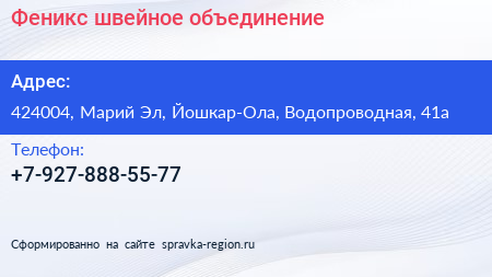 Феникс, швейное объединение по адресу 424004, Марий Эл, Йошкар-Ола, Водопроводная, 41а в дальнейшем Организация, размещена в следующих категориях: