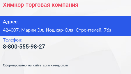 Химкор, торговая компания по адресу 424007, Марий Эл, Йошкар-Ола, Строителей, 76а в дальнейшем Организация, размещена в следующих категориях: