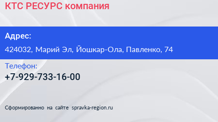 КТС РЕСУРС, компания по адресу 424032, Марий Эл, Йошкар-Ола, Павленко, 74 в дальнейшем Организация, размещена в следующих категориях: