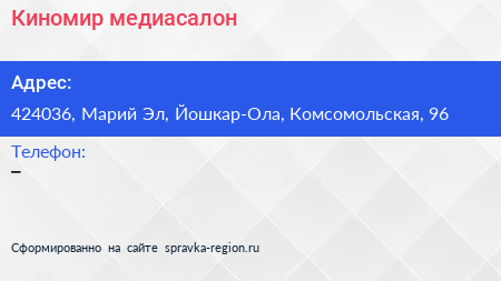 Киномир, медиасалон по адресу 424036, Марий Эл, Йошкар-Ола, Комсомольская, 96 в дальнейшем Организация, размещена в следующих категориях: