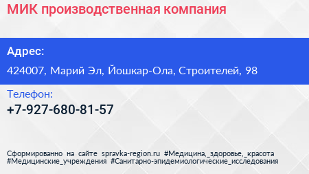 МИК, производственная компания по адресу 424007, Марий Эл, Йошкар-Ола, Строителей, 98 в дальнейшем Организация, размещена в следующих категориях:
