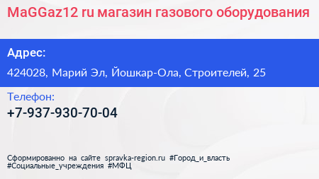 MaGGaz12.ru, магазин газового оборудования по адресу 424028, Марий Эл, Йошкар-Ола, Строителей, 25 в дальнейшем Организация, размещена в следующих категориях: