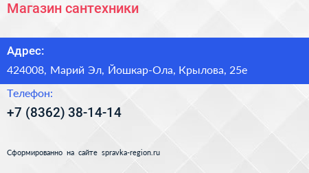 Магазин сантехники по адресу 424008, Марий Эл, Йошкар-Ола, Крылова, 25е в дальнейшем Организация, размещена в следующих категориях: