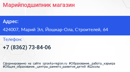 Марийподшипник, магазин по адресу 424007, Марий Эл, Йошкар-Ола, Строителей, 64 в дальнейшем Организация, размещена в следующих категориях: