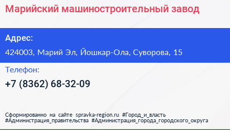 Марийский машиностроительный завод по адресу 424003, Марий Эл, Йошкар-Ола, Суворова, 15 в дальнейшем Организация, размещена в следующих категориях: