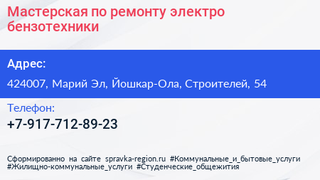 Мастерская по ремонту электро-бензотехники по адресу 424007, Марий Эл, Йошкар-Ола, Строителей, 54 в дальнейшем Организация, размещена в следующих категориях: