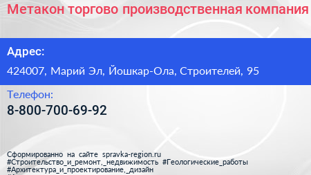 Метакон, торгово-производственная компания по адресу 424007, Марий Эл, Йошкар-Ола, Строителей, 95 в дальнейшем Организация, размещена в следующих категориях: