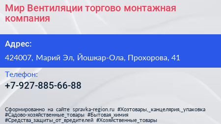 Мир Вентиляции, торгово-монтажная компания по адресу 424007, Марий Эл, Йошкар-Ола, Прохорова, 41 в дальнейшем Организация, размещена в следующих категориях: