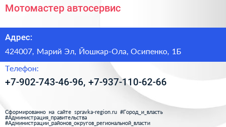 Мотомастер, автосервис по адресу 424007, Марий Эл, Йошкар-Ола, Осипенко, 1Б в дальнейшем Организация, размещена в следующих категориях: