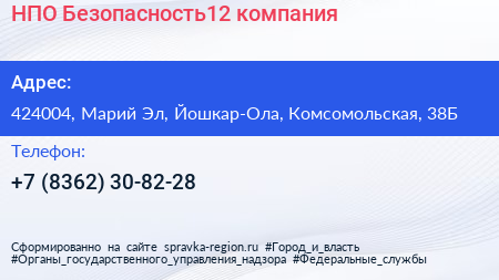 НПО Безопасность12, компания по адресу 424004, Марий Эл, Йошкар-Ола, Комсомольская, 38Б в дальнейшем Организация, размещена в следующих категориях: